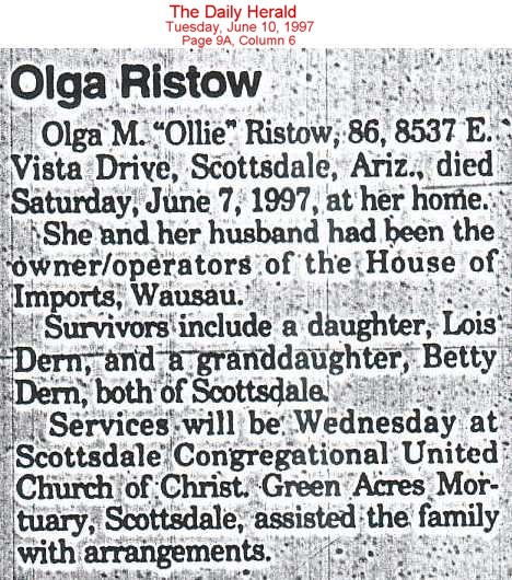 Alex's brother Alfred Ristow Death Notice | Alex's brother Alfred Ristow Obit | Alex's sister-in-law Olga Ristow Obit